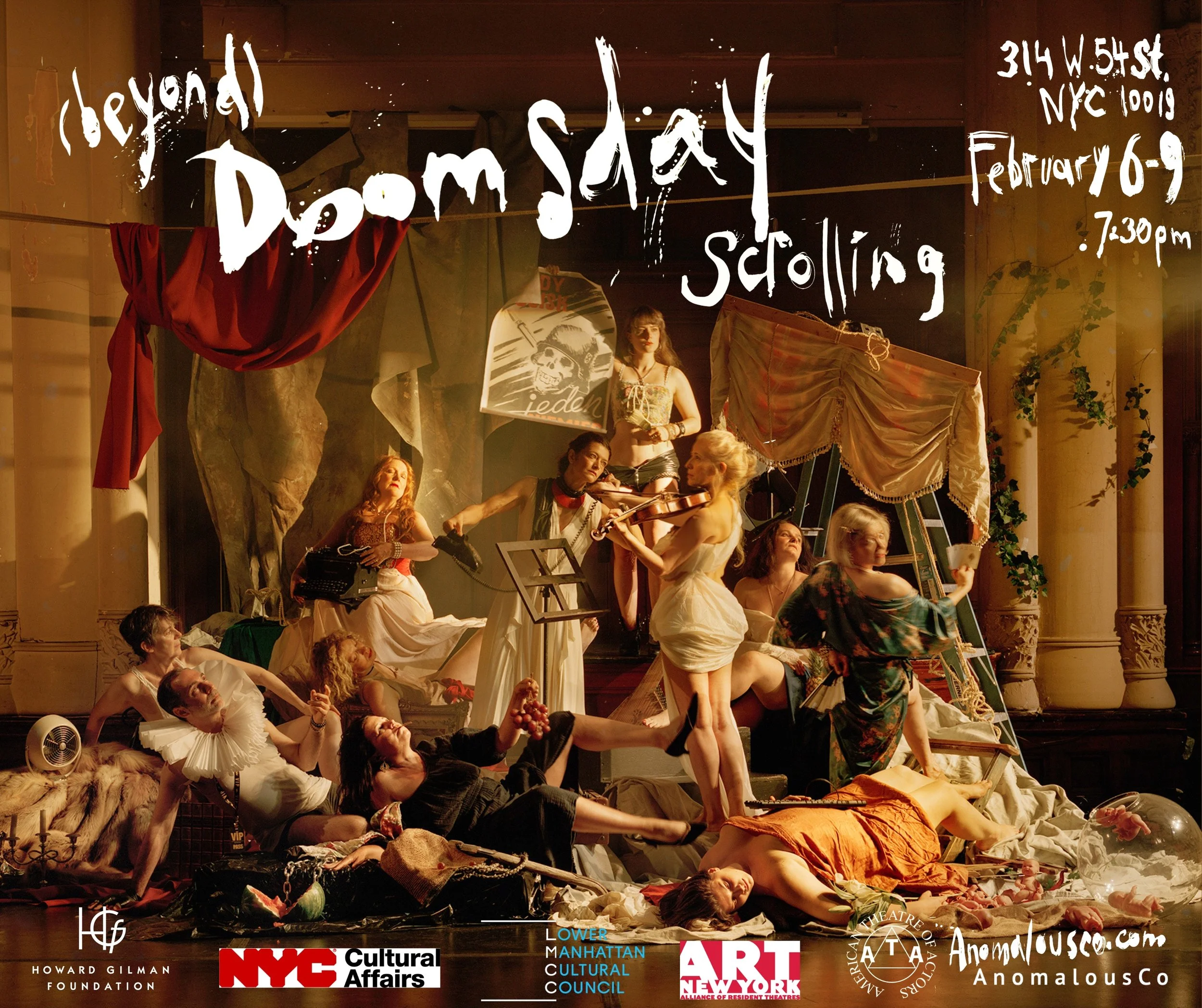 February 6-29, 2025: (beyond) Doomsday Scrolling - a three-week run at ATA, NYC.February 19-29,2023: (beyond) Doomsday Scrolling - a two-week run at HERE, NYC.March 19,2022: (beyond) Doomsday Scrolling. In the first performance of (beyond) Doomsday Scrolling AnomalousCo collective raised nearly $8500 in ticket sales and donor contributions for humanitarian support to Ukraine and its refugees.April 29,2022: (beyond) Doomsday Scrolling. The Center at West Park, NYC. This second iteration of the show raised $3000 in ticket sales and an additional 1500 in personal donations for humanitarian aid to refugees in Ukraine and Central America.
